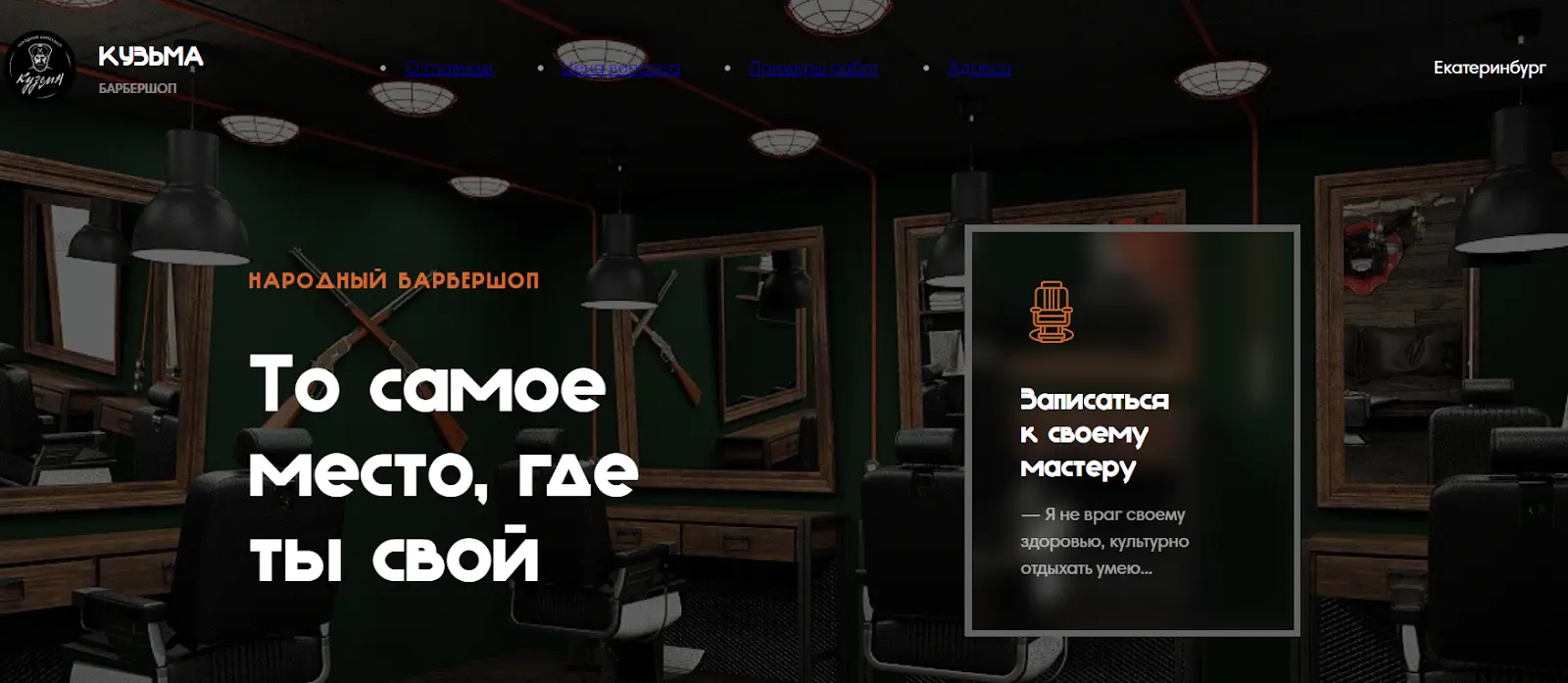 В 2018 году жителям Екатеринбурга представили барбершоп нового формата — «Кузьмич», названный в честь персонажа из фильмов «Особенности национальной охоты» и «Особенности национальной рыбалки». Мы, разумеется, разработали для него сайт, полностью отражающий задуманный образ.