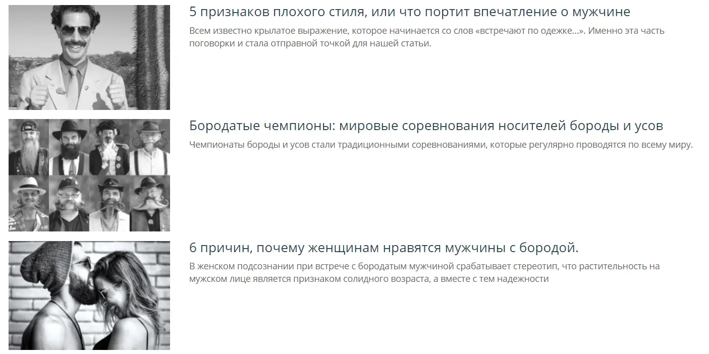 В блоге мы начали публиковать статьи, оптимизированные под профильные поисковые запросы: «Стрижка помпадур», «Королевское бритьё», «Стрижка кудрявых волос» и другие. Параллельно появились имиджевые материалы о мужском стиле, которые расширяли тематику и усиливали позиционирование бренда.