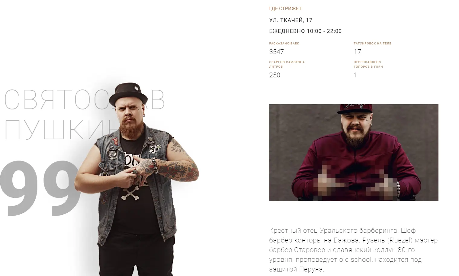 Отдельной задачей стала фотосъёмка каждого барбера. Фотографии мастеров на сайте барбершопа — стандарт, который есть почти у всех конкурентов. Но мы решили пойти дальше: для каждого барбера создали отдельную страницу с описанием его личной истории, достижений и, конечно, возможностью записаться именно к нему.