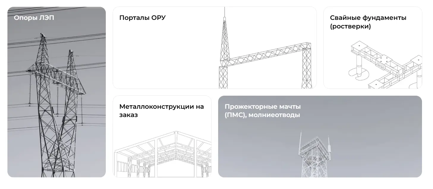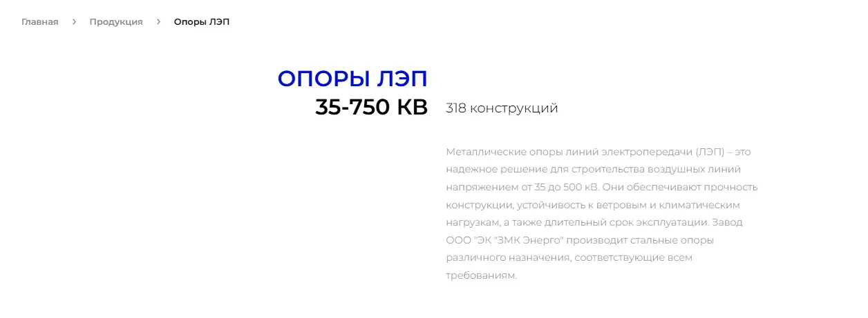 Каталог на сайте типичный для B2B-сегмента, но с поправкой на специфику продукта: здесь не получится просто выбрать опору ЛЭП, добавить в корзину и оформить заказ. Всё гораздо сложнее. Однако компания предлагает типовые конструкции, структурированные по категориям — «Опоры», «Порталы», «Мачты» и т.д.