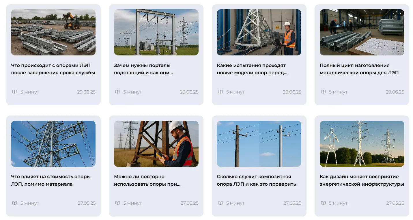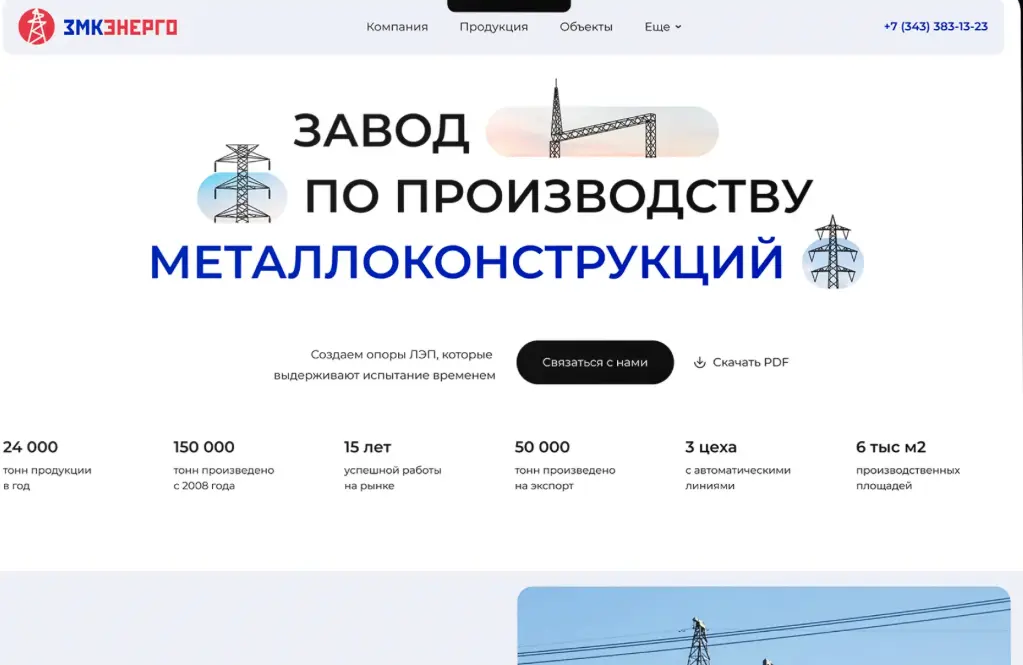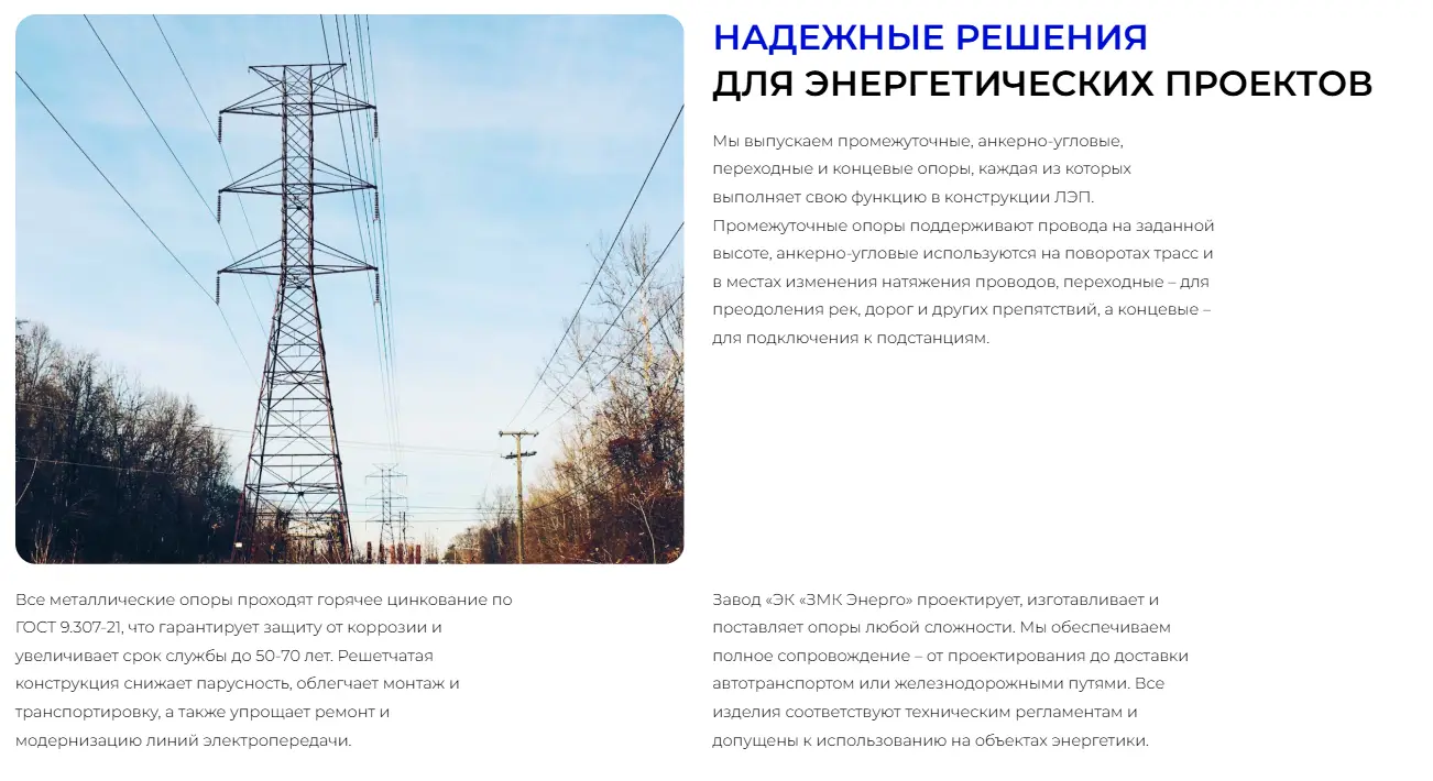 Завод с 16-летним опытом в производстве металлоконструкций для опор ЛЭП обратился к нам с задачей срочной разработки нового сайта. Их предыдущий ресурс был создан на платформе Webflow, американском конструкторе, который прекратил работу в РФ. Отсюда и возникла острая необходимость в оперативном решении.
