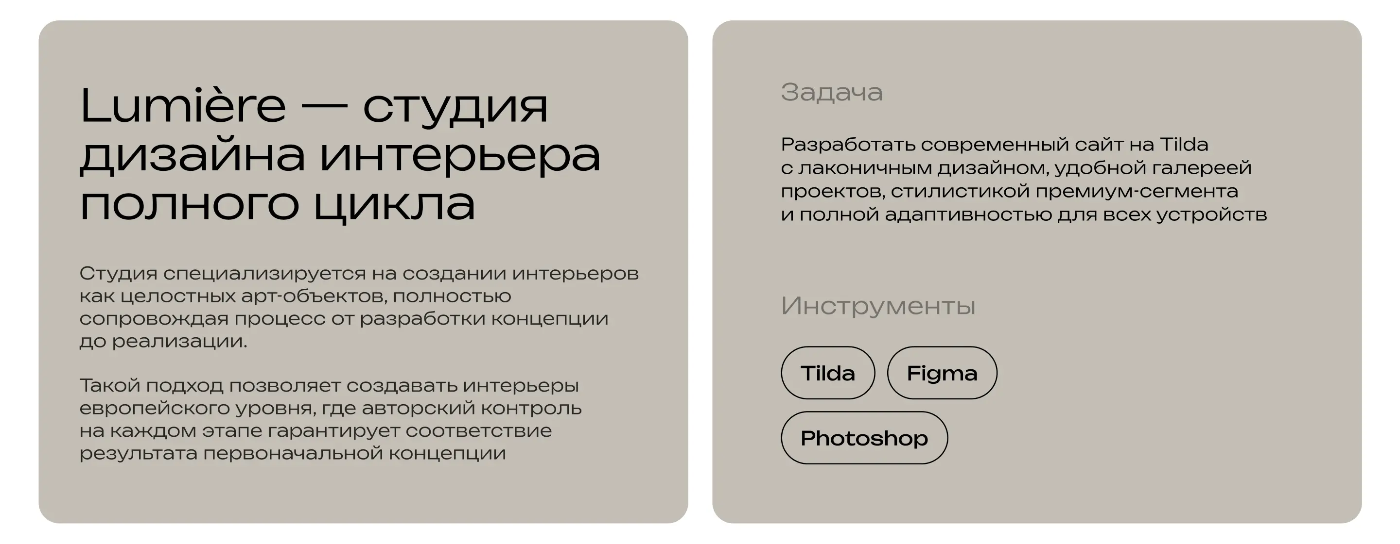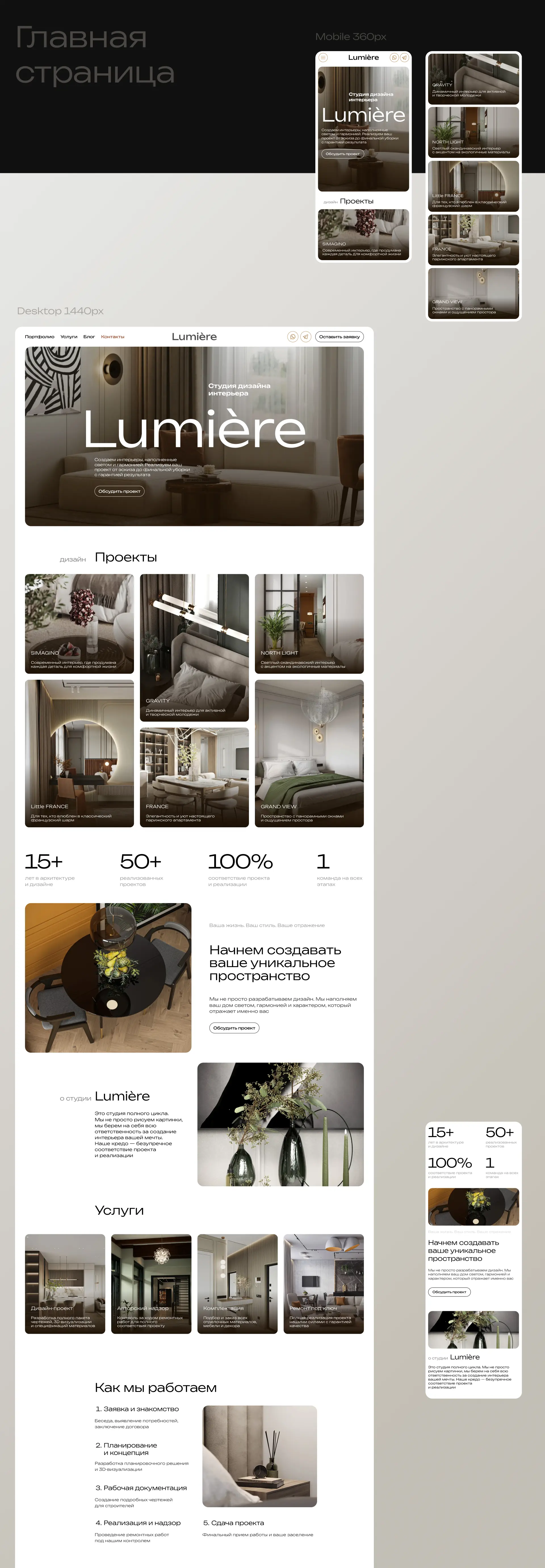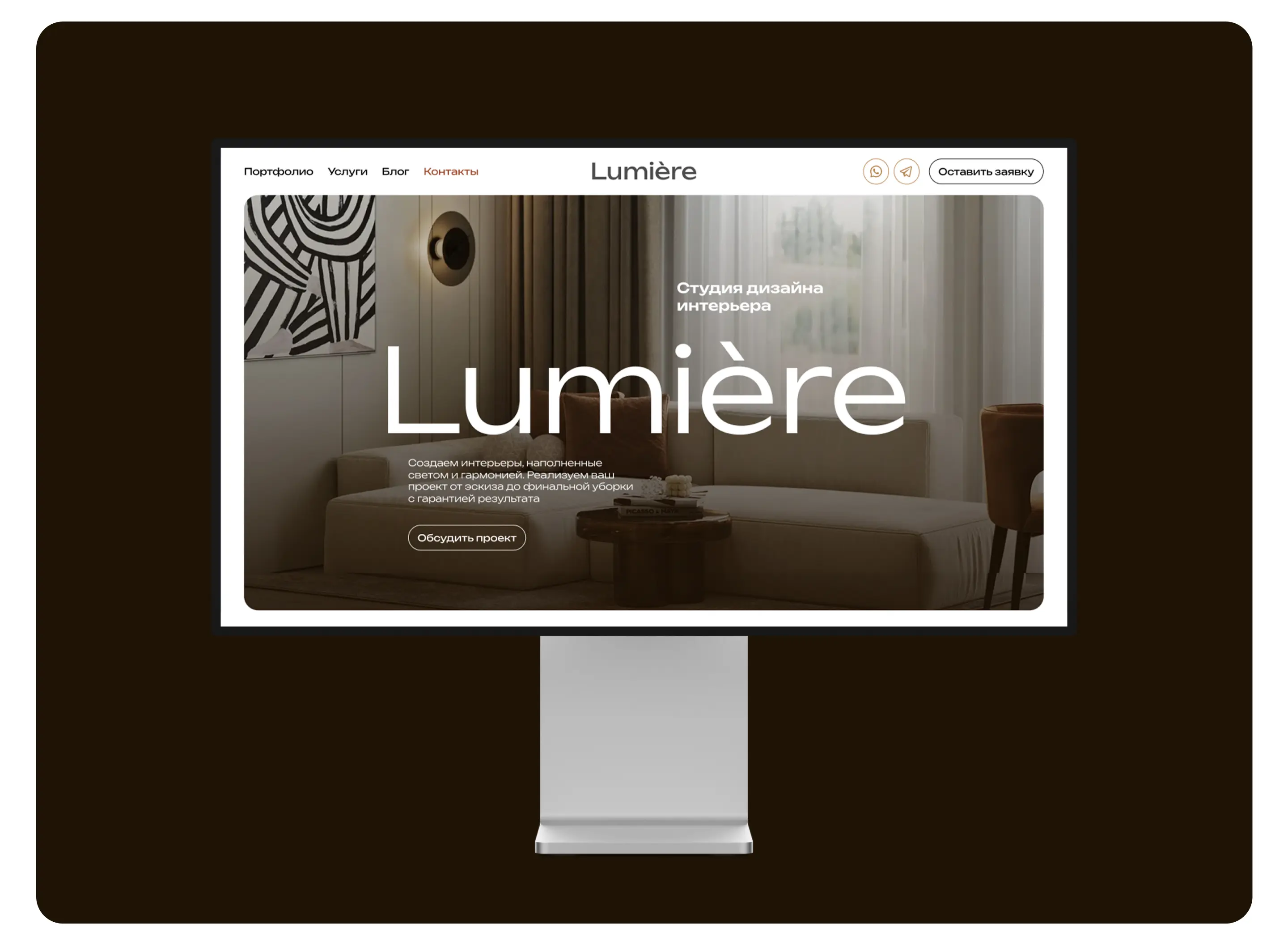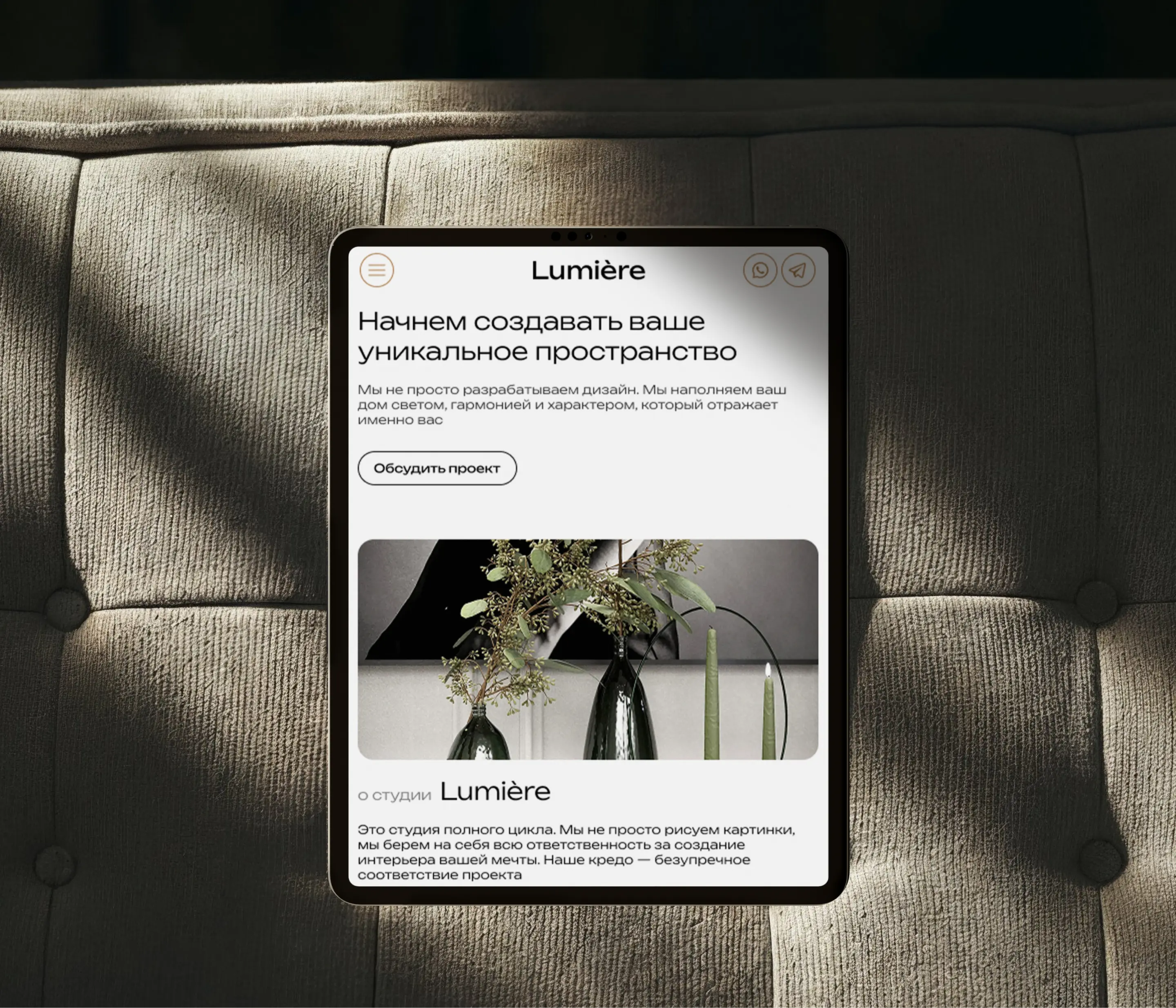 Сайт для студии дизайна интерьеров Lumière. Разработали на Tilde с использованием Zero Block, чтобы сайт имел собственный стиль, а не шаблонный вид. Добавили галерею проектов и детальные страницы кейсов. Настроили пять адаптаций под разные размеры экранов и SEO для поискового продвижения