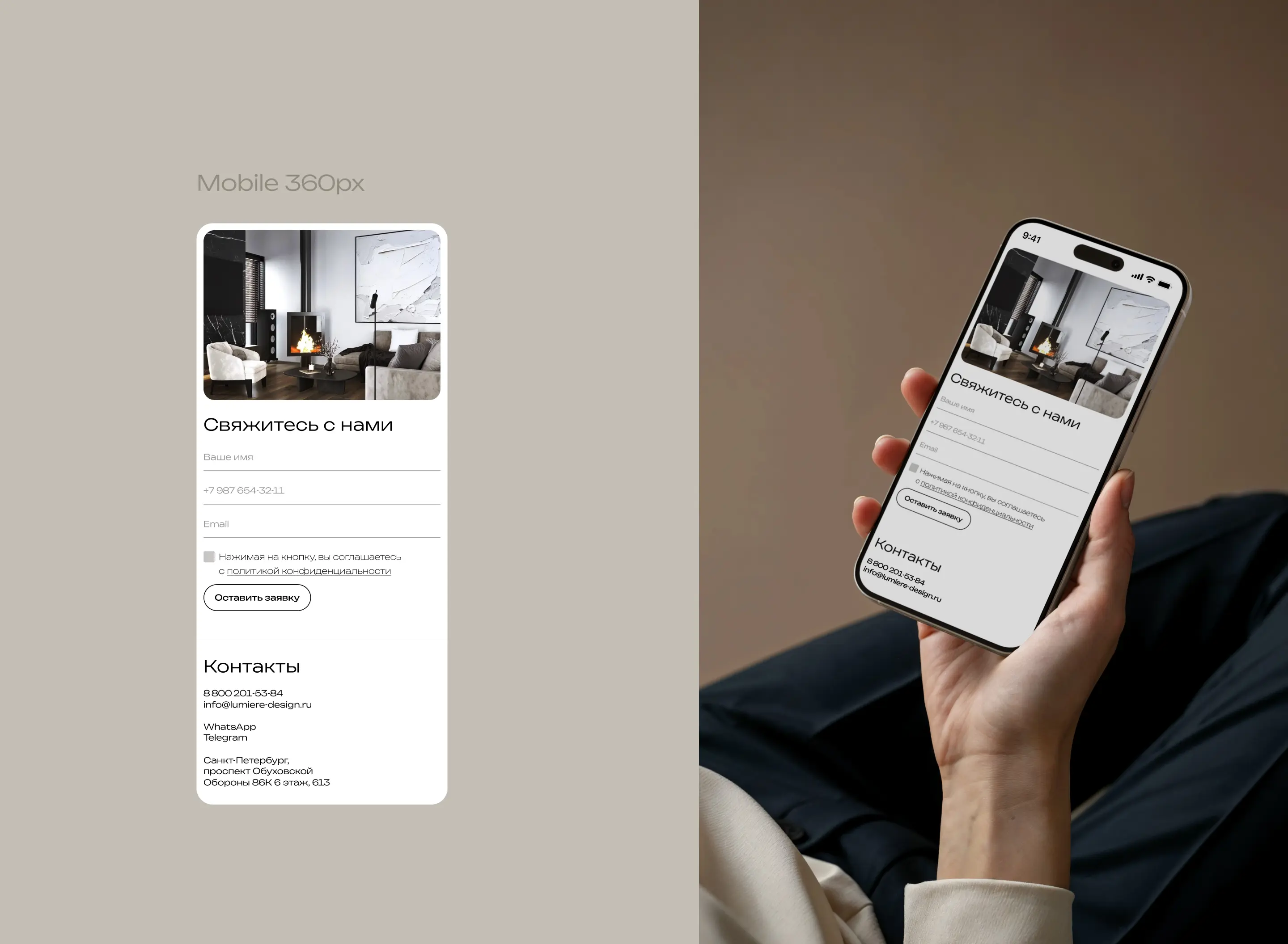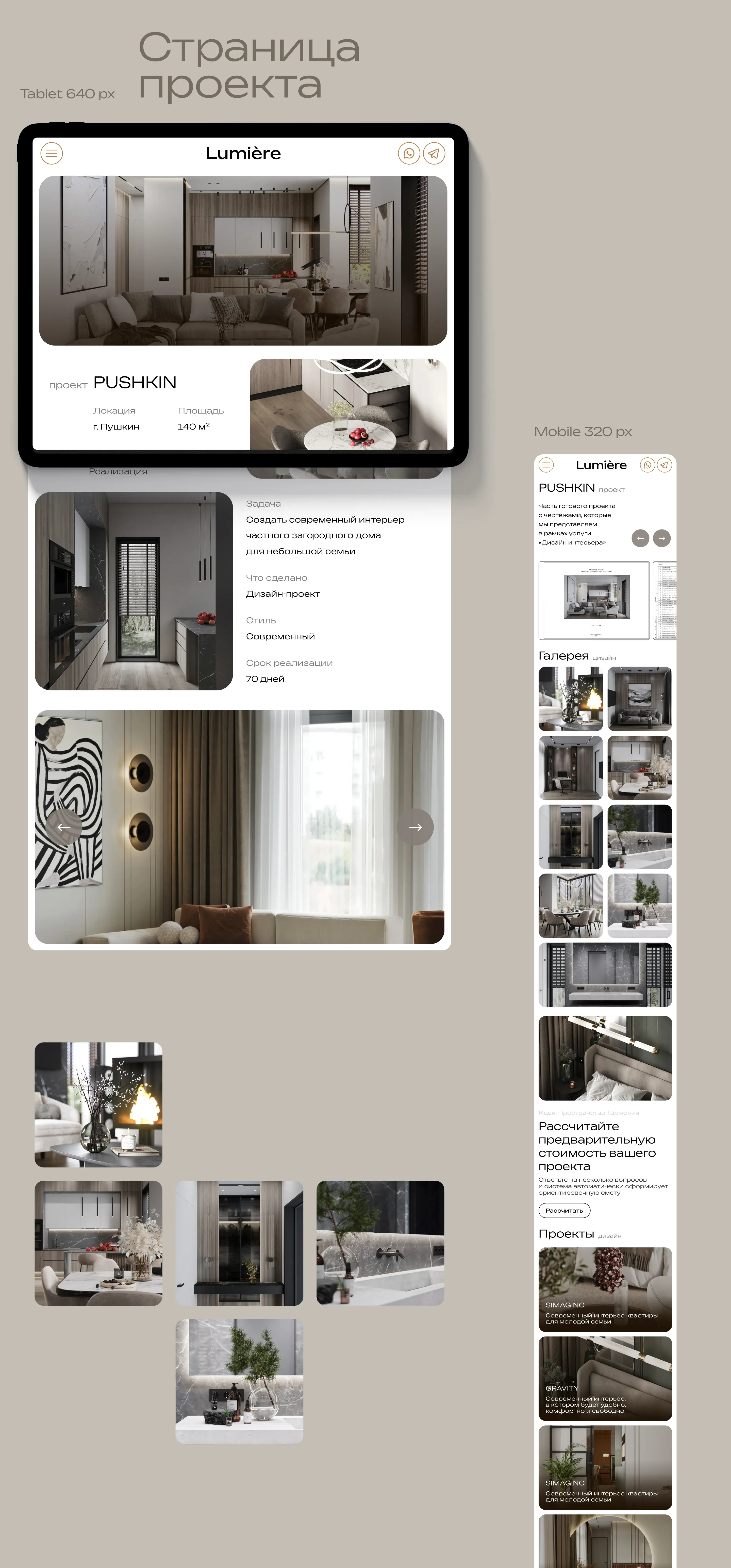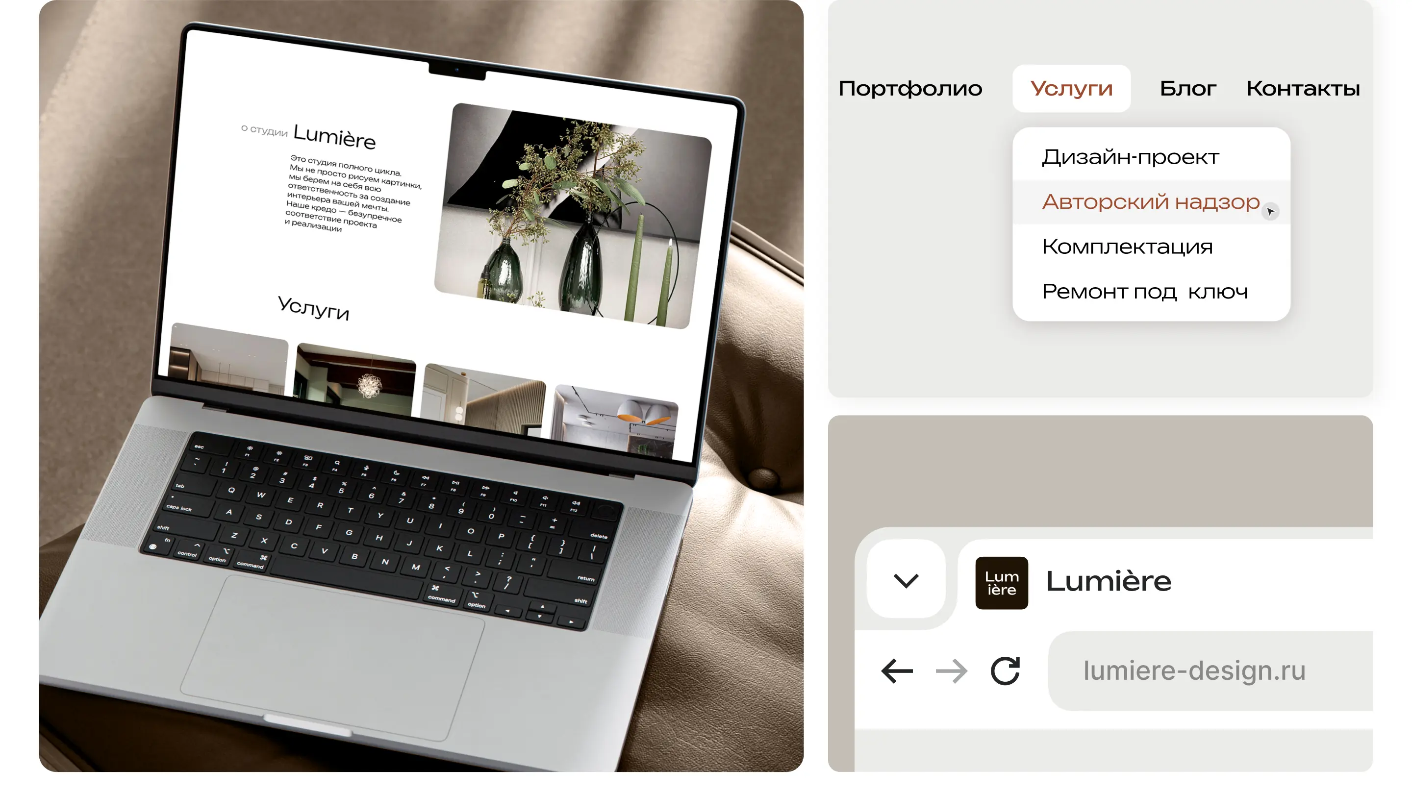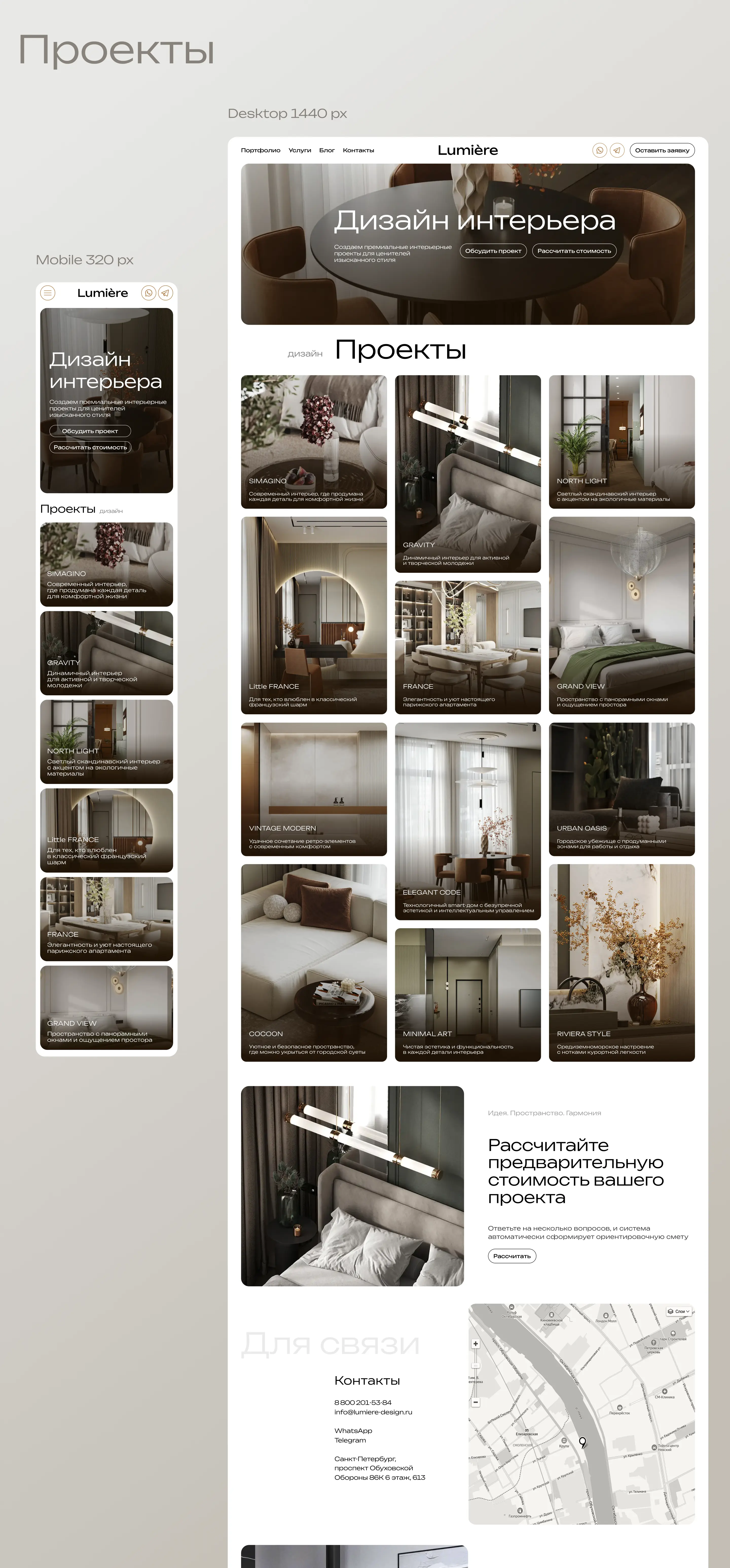 Сайт для студии дизайна интерьеров Lumière. Разработали на Tilde с использованием Zero Block, чтобы сайт имел собственный стиль, а не шаблонный вид. Добавили галерею проектов и детальные страницы кейсов. Настроили пять адаптаций под разные размеры экранов и SEO для поискового продвижения