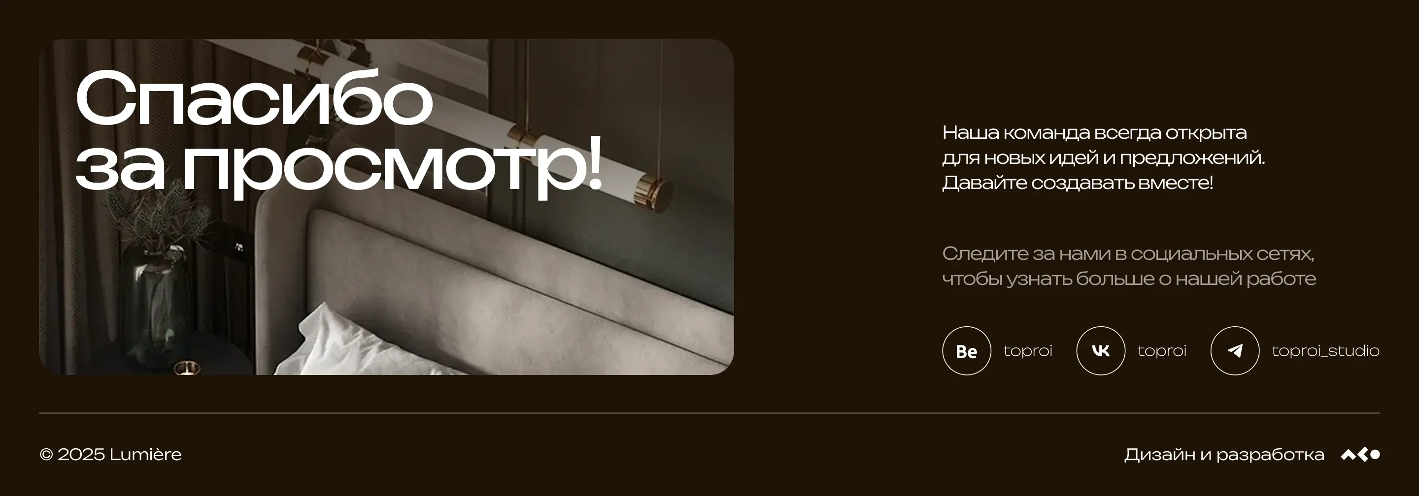 Сделали не просто красиво, а выразительно и понятно! Многие думают, что для дизайн-студий достаточно просто показать портфолио — мы же пошли дальше. Lumiere Design — это про свет, пространство и настроение. Мы создали сайт, который передаёт это через лаконичный и воздушный дизайн с акцентом на фотографии проектов. Вместо перегруженности — максимум пространства, строгая сетка, тонкая типографика и аккуратные анимации, которые подчеркивают профессионализм и стиль компании. Мы всегда ЗА адаптивность и удобство, поэтому сайт одинаково хорошо смотрится и на большом экране, и на телефоне. Если думаете, что ваш сайт не может заиграть новыми красками — мы готовы доказать обратное! Вдохновиться полным кейсом и поддержать нас: 💙 TopROI 📃 DProfile 😇 Behance #кейсTopROI