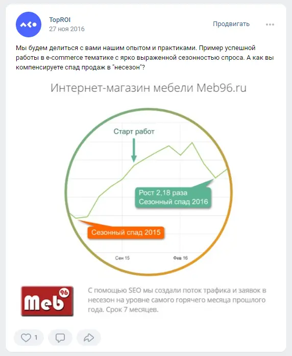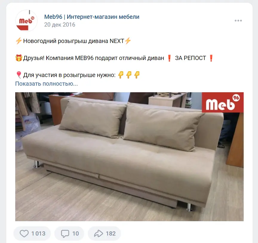 Соцсети, особенно ВКонтакте, показали совсем другой эффект. Мы начали проводить розыгрыши: сертификатов на мебель, полезных товаров для дома, иногда скидок или бесплатной доставки.