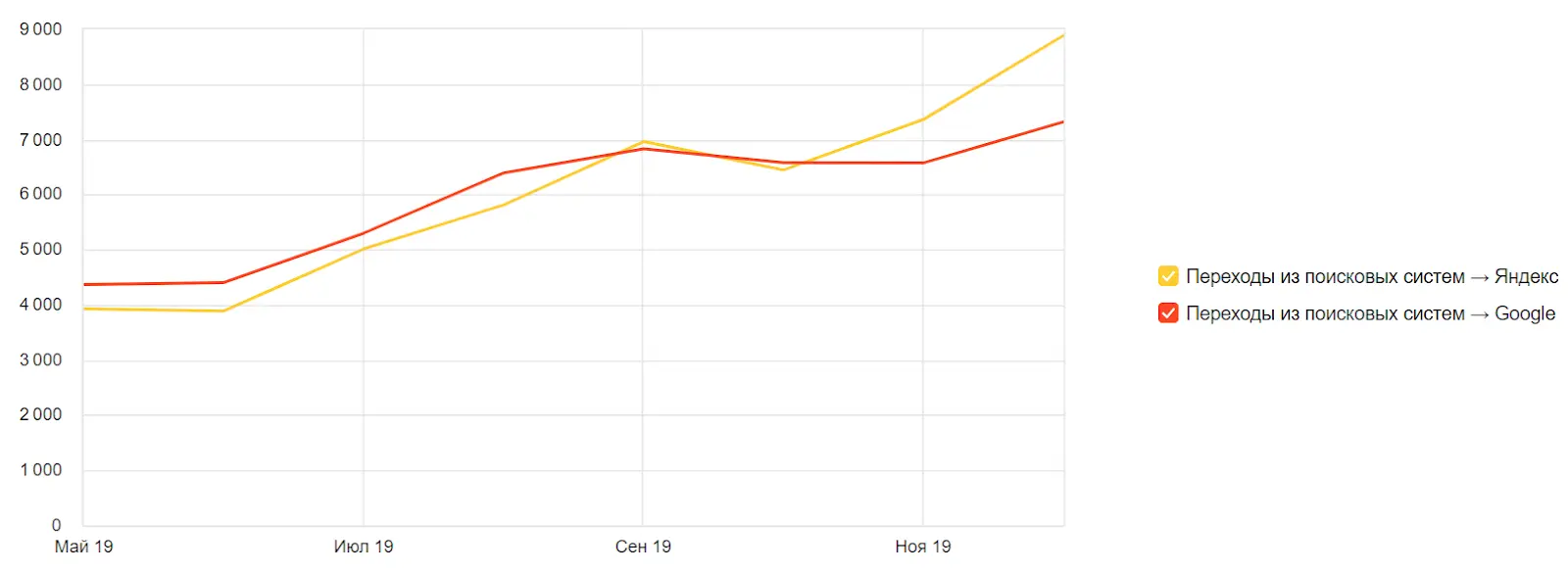Такое решение позволило избежать каннибализации и учитывать алгоритмические особенности обеих систем. Поддомены быстро росли в Яндексе, а в Google трафик начал увеличиваться благодаря вложенным папкам, воспринимаемым как единая структура. Рост по обеим системам был подтверждён конкретными графиками: после внедрения гибридной схемы количество переходов из поиска пошло уверенно вверх.