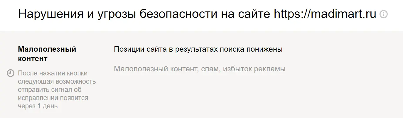 В 2022 году Madimart попал под фильтр «Малополезный контент». Для боевого проекта это стало бы серьёзным ударом и сигналом к немедленному пересмотру стратегии. Но в нашем случае это было ожидаемым и даже полезным результатом. Цель Madimart с самого начала заключалась в тестировании границ алгоритмов и выявлении триггеров, которые вызывают санкции.