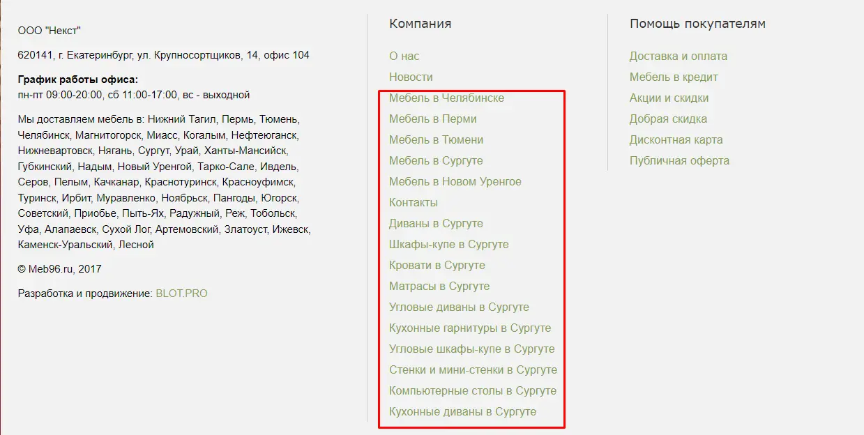 Каждая ссылка вела на свою страницу, оптимизированную под конкретный поисковый запрос. Внутри этих страниц мы подробно описывали условия доставки, указывали преимущества для жителей именно этого региона и размещали ключевые фразы.